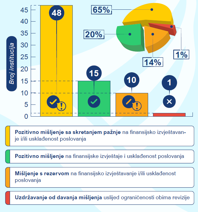 Od ukupno 74 institucije BiH, za njih 15 (ili 20%) izraženo je pozitivno mišljenje i na finansijske izvještaje i usklađenost poslovanja. Pozitivno mišljenje, uz skretanje pažnje na aspekte poslovanja koji se odnose na finansijsko izvještavanje i/ili usklađenost, izraženo je kod 48 institucija (ili 65%). Ured je izrazio mišljenje s rezervom na finansijsko izvještavanje i/ili usklađenost kod 10 institucija (ili 14%). Uslijed ograničenosti obima revizije mišljenje nije bilo moguće izraziti kod jedne institucije (1%).